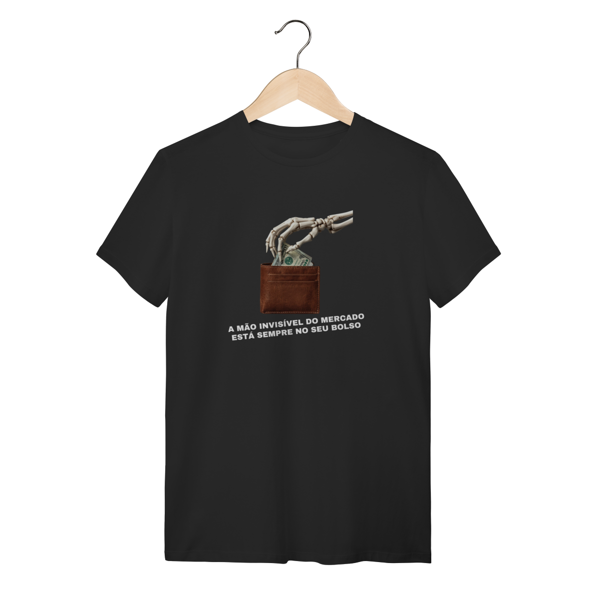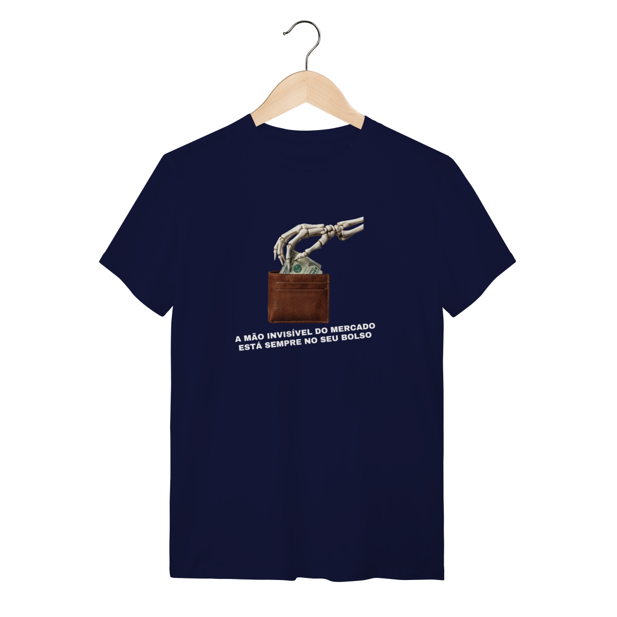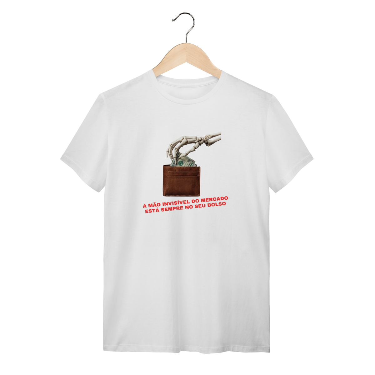 O que essa peça representa: Esta estampa é o deboche necessário contra o dogma liberal. A "Mão Invisível do Mercado" é aqui revelada como ela realmente opera: uma mão de esqueleto que estrangula a classe trabalhadora enquanto promete prosperidade. Integrante da categoria Sátira Ativa, esta peça tira a teoria econômica dos livros e a coloca na rua com um design minimalista e uma mensagem soberana. É o vestuário de quem não aceita ser guiado por fantasmas macroeconômicos e escolhe a consciência como escudo.