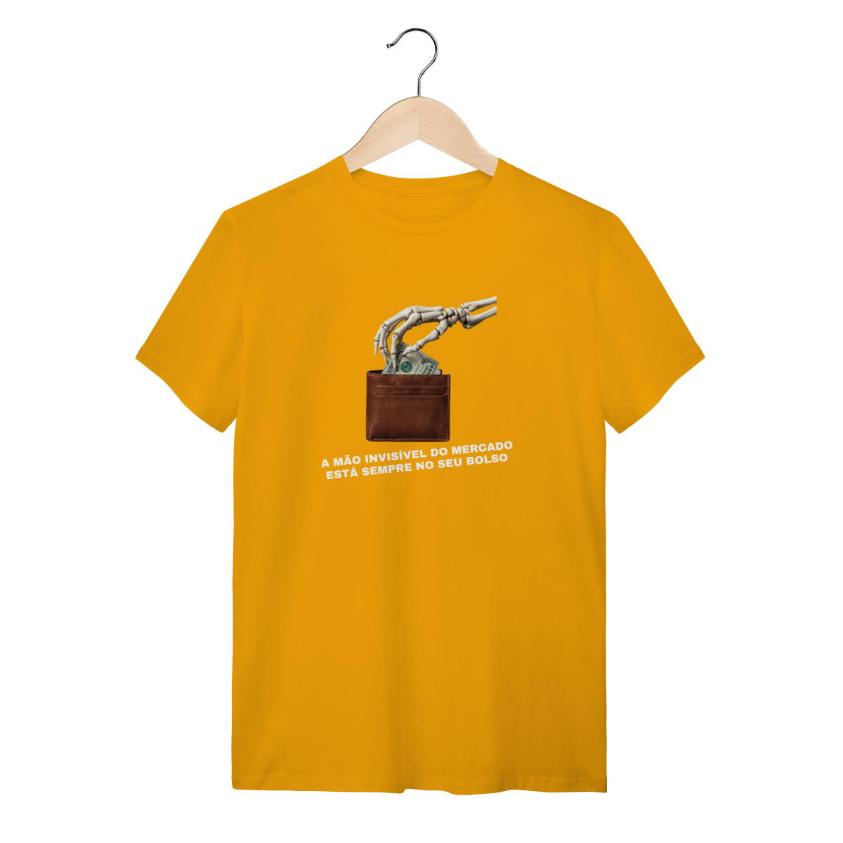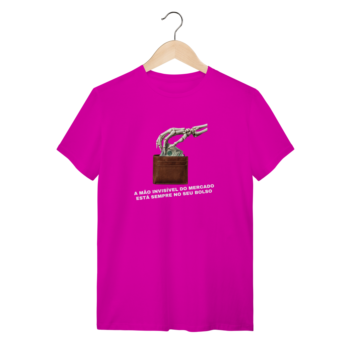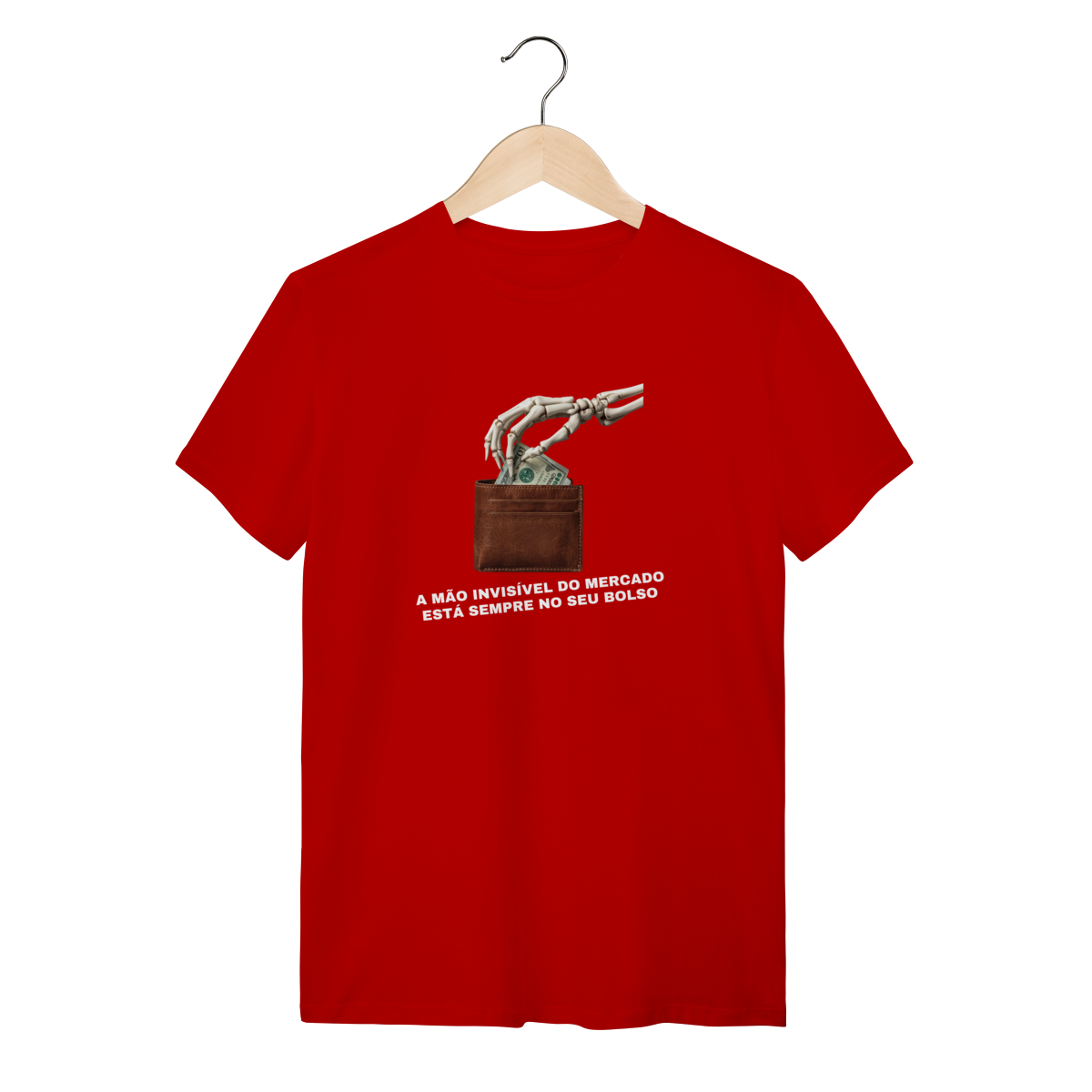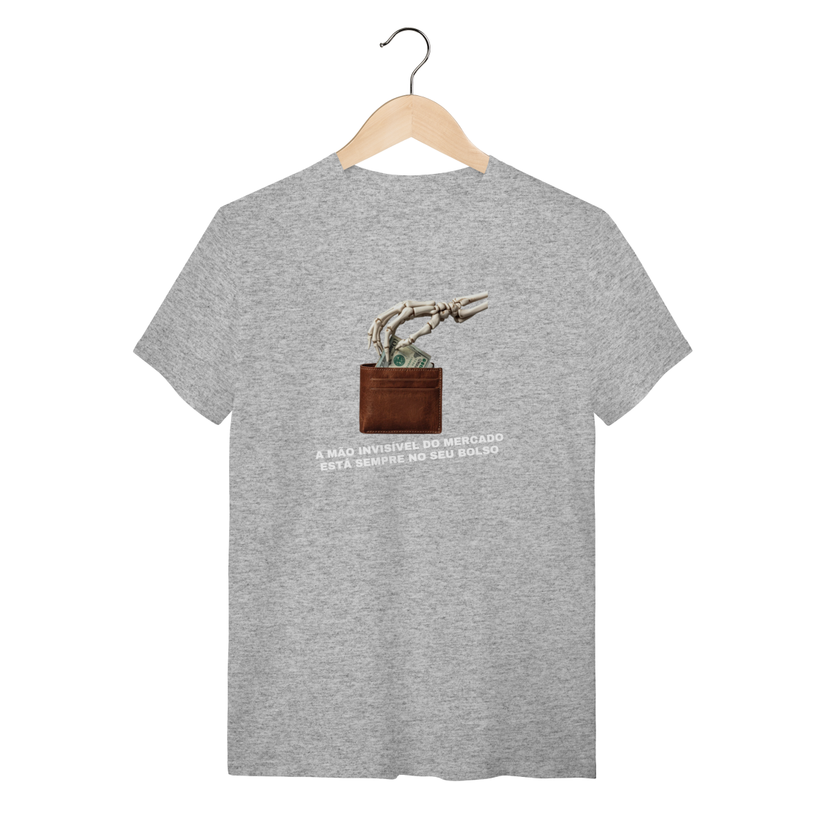 O que essa peça representa: Esta estampa é o deboche necessário contra o dogma liberal. A "Mão Invisível do Mercado" é aqui revelada como ela realmente opera: uma mão de esqueleto que estrangula a classe trabalhadora enquanto promete prosperidade. Integrante da categoria Sátira Ativa, esta peça tira a teoria econômica dos livros e a coloca na rua com um design minimalista e uma mensagem soberana. É o vestuário de quem não aceita ser guiado por fantasmas macroeconômicos e escolhe a consciência como escudo.