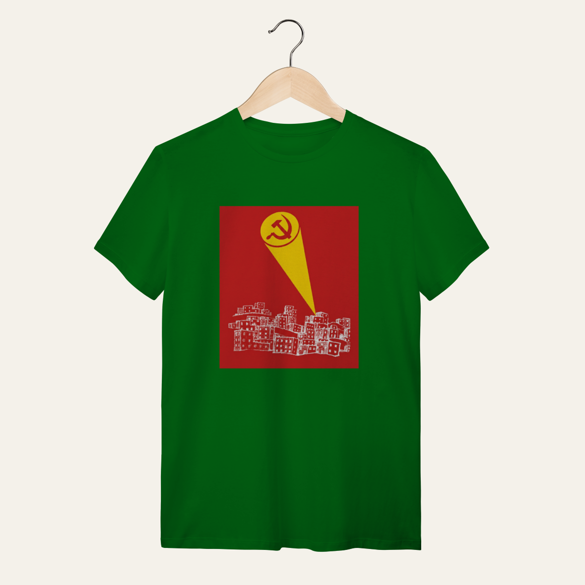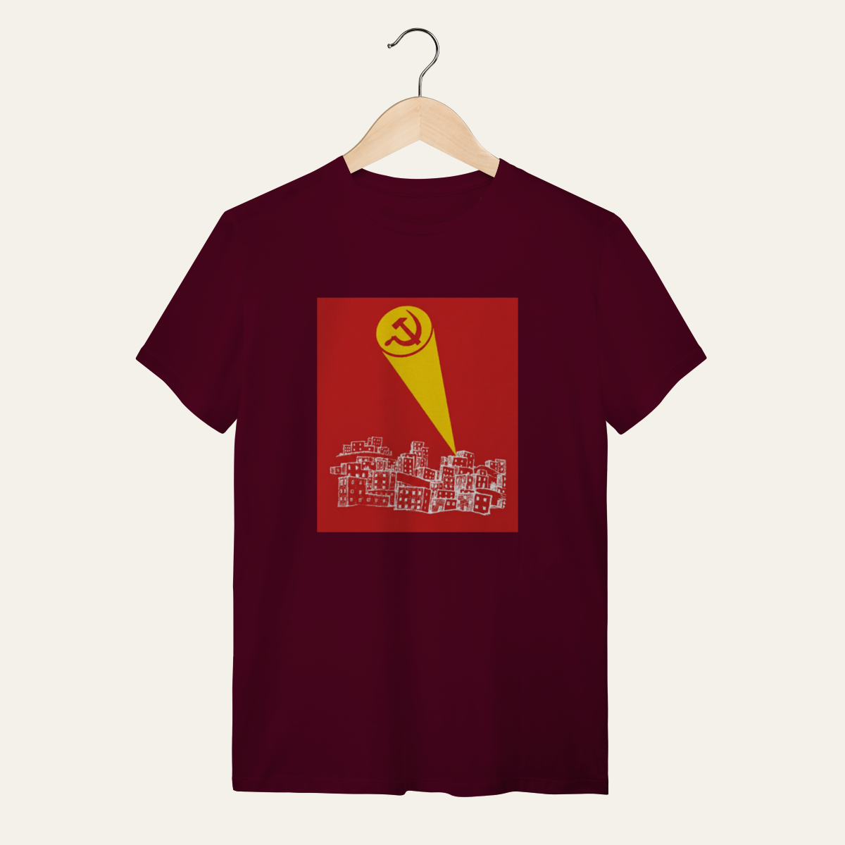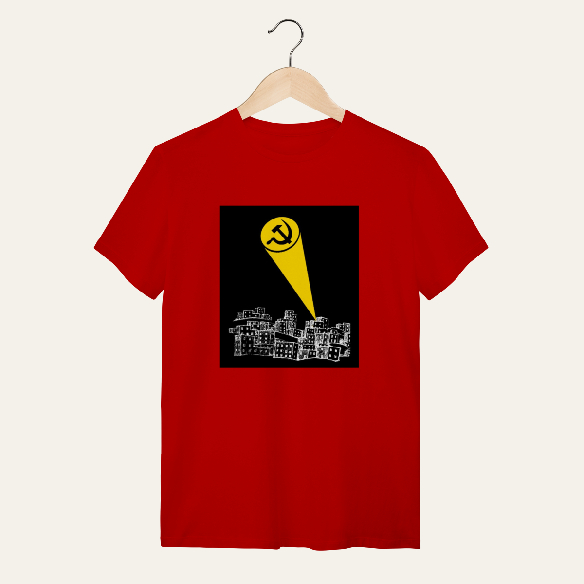 • O que essa peça representa: Esta não é apenas uma camiseta; é um manifesto visual de um momento histórico. A estampa do sinal da foice e martelo projetado sobre a periferia é a síntese da Sátira Ativa, utilizando a estética dos heróis para recusar a neutralidade e reafirmar a soberania popular no cotidiano. Projetada para a categoria Sátira Ativa, ela subverte o imaginário pop para convocar a organização coletiva, servindo como suporte para quem ocupa a rua com irreverência e consciência crítica.